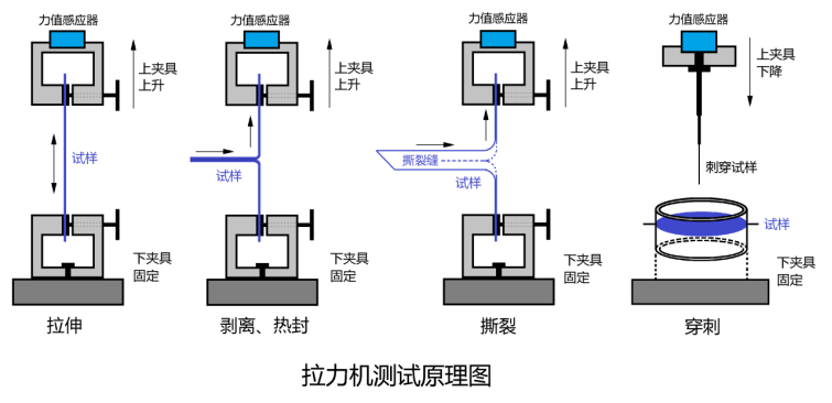 基礎實驗(拉伸、穿刺、剝離、剪切、彎曲、撕裂、熱封、活動性等實驗)(可配引伸計)。