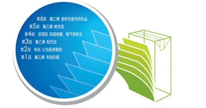 紙鋁塑復(fù)合材料由紙、鋁、聚乙烯組成的六層復(fù)合而成。紙板是其中的主要材料,提供了包裝的穩(wěn)定性、強度及印刷面的平滑度;聚乙烯能夠阻擋外部的濕氣,并使紙板粘合在鋁箔上;鋁箔能夠有效阻隔空氣和光線,避免細菌污染食品。