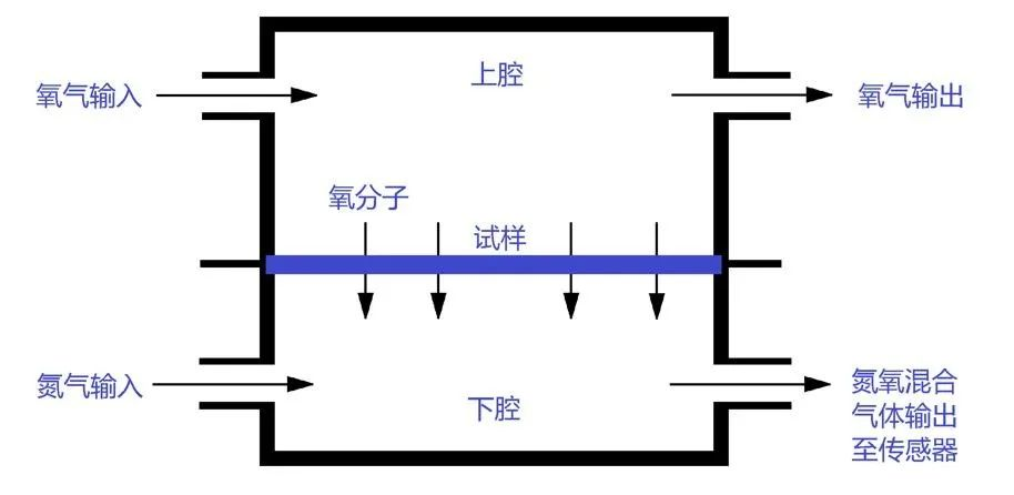 Y310 2.0 氧氣透過率測定儀采用庫侖電量法原理。預(yù)先處理好的試樣固定在測試腔中間,高純氧氣在薄膜的上腔流動,高純氮氣(載氣)在下腔流動,氧分子透過薄膜擴散到另一側(cè)的氮氣中,被流動的氮氣攜帶至傳感器,通過對傳感器測量到的氧氣濃度進行分析,從而計算出氧氣透過率。