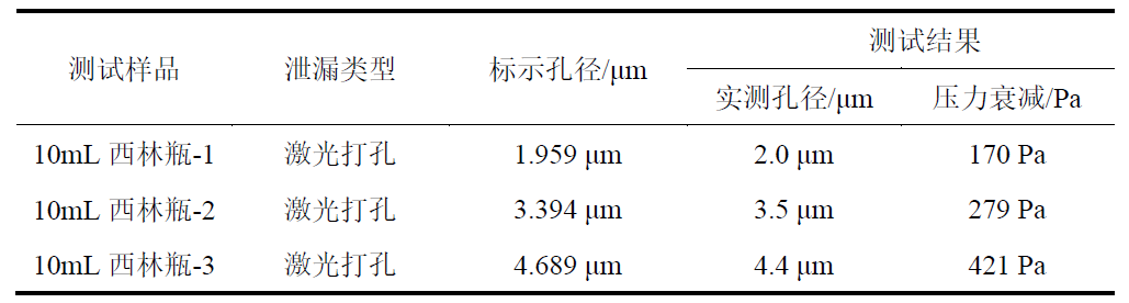 陽性樣品的制備采用激光打孔制備技術,其漏孔幾何形狀和內部氣體流動行為最接近真實缺陷,打孔位置在瓶身。把陽性樣品放入測試腔進行測試,通過陽性樣品的標示孔徑與儀器測試推算出來的孔徑做對比,來驗證儀器的準確度。陽性樣品見圖4,測試結果見表1。