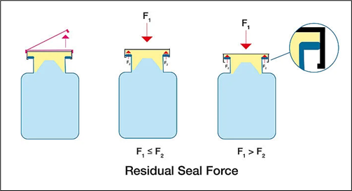 USP1207.3中提出,殘余密封力(RSF)測試法是測量西林瓶軋蓋后壓縮力的一種間接方法,適用于玻璃或塑料西林瓶,其有無破壞性的特點(diǎn)。RSF指的是西林瓶軋蓋后,膠塞對鋁蓋產(chǎn)生的應(yīng)力。應(yīng)力越大,說明軋蓋越緊;應(yīng)力越小,說明軋蓋越松。力值示意圖見圖1。