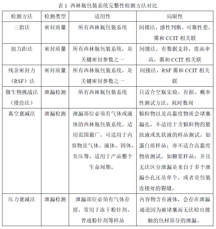 總的來說,我國的西林瓶包裝系統(tǒng)密封完整性檢查研究還處于初級階段。密封完整性的方法各有優(yōu)劣,需重點(diǎn)關(guān)注內(nèi)容物的形態(tài)來選擇合適的檢測方法,確保密封完整性檢查的順利通過。包裝密封質(zhì)量檢測(Seal Quality Test )和包裝泄漏測試(Integrity Leak Test)共同確保整個產(chǎn)品生命周期的包裝系統(tǒng)密封性,結(jié)合使用可加強(qiáng)產(chǎn)品生產(chǎn)過程控制?,F(xiàn)針對以上提及的檢測方法的適用性及局限性做對比,見下表1。