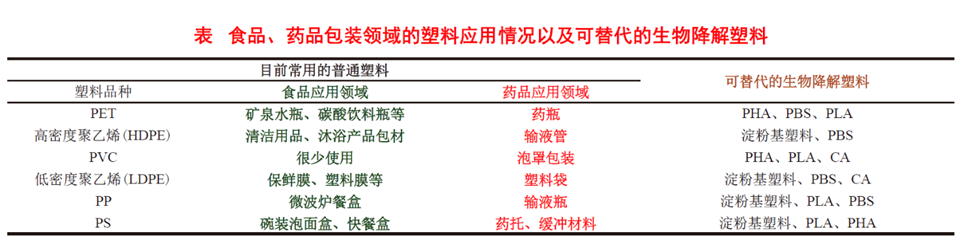 目前,可用于食品藥品的生物塑料包裝材料主要有:淀粉基生物塑料(指淀粉含量15%以上的通過(guò)填充、共混塑料及全淀粉塑料);聚乳酸PLA;聚羥基脂肪酸酯類(PHA)、聚丁二酸丁二醇酯(PBS)、乙酸纖維素等。如下表所示: