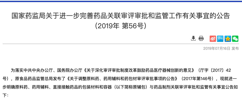 為落實中共中央辦公廳、國務院辦公廳《關于深化審評審批制度改革鼓勵藥品醫療器械創新的意見》(廳字〔2017〕42號),原食品藥品監管總局發布了《關于調整原料藥、藥用輔料和藥包材審評審批事項的公告》(20