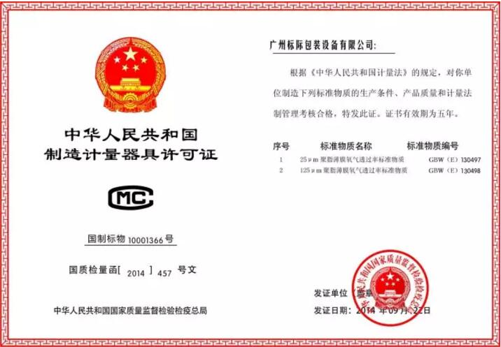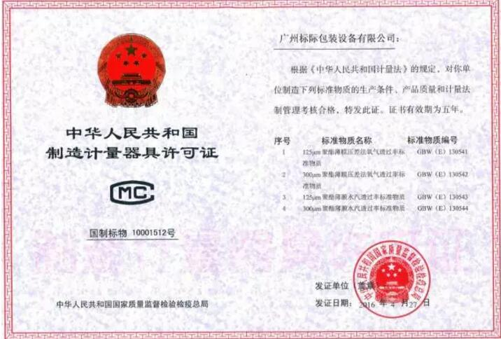 氧氣透過率國家標準物質制造計量器具許可證——廣州標際(GBPI)
