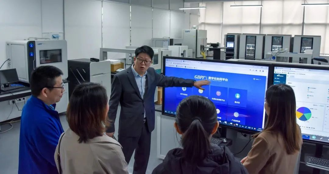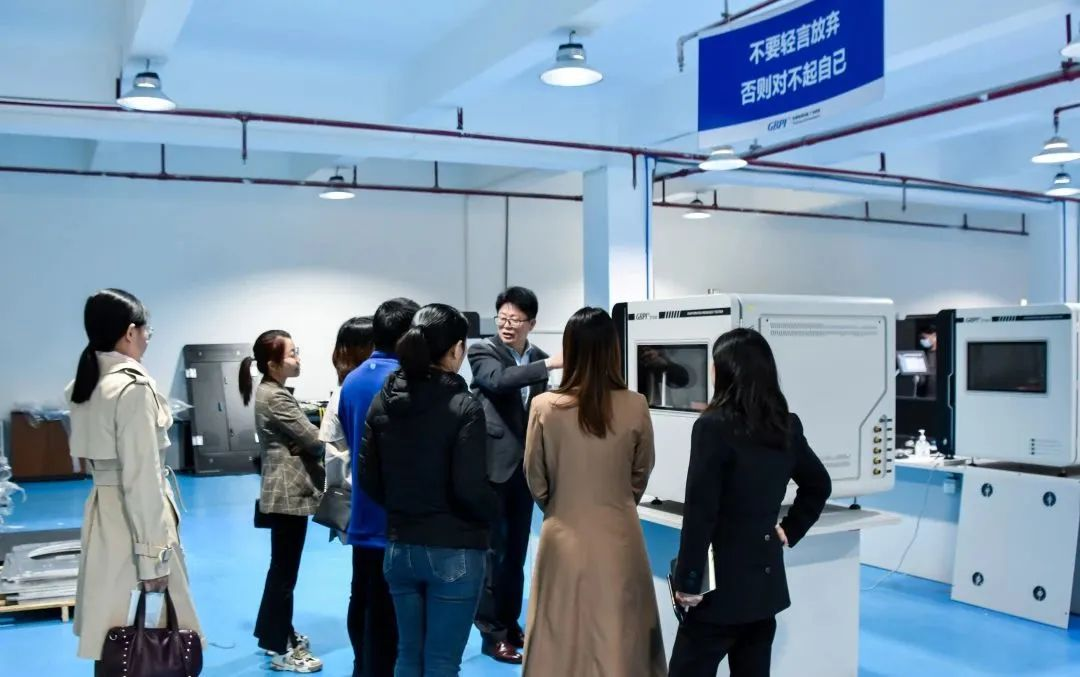 廣州標際總經理周學惠帶領仲主任、趙教授領導一行參觀了阻隔性能檢測儀器實驗室、基礎儀器生產車間、數字化實驗室、應用場景綜合展廳等場地。