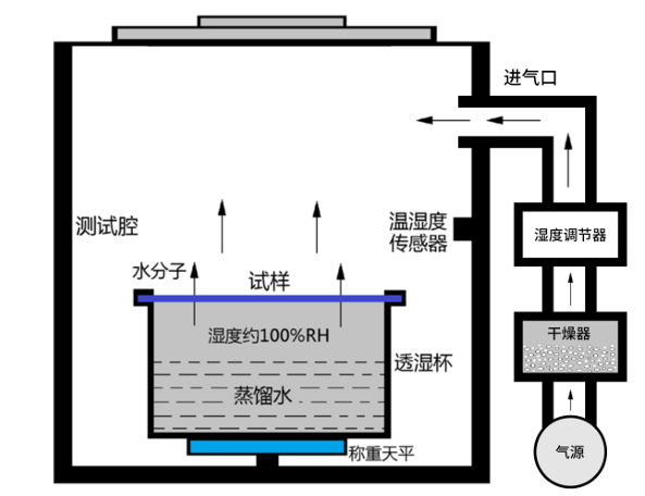 在干燥潔凈的透濕杯內(nèi)加入蒸餾水,用預(yù)先處理好的試樣密封透濕杯放置于測試腔內(nèi),通過控制溫度、濕度等使得透濕杯內(nèi)蒸餾水蒸發(fā),蒸發(fā)的水蒸氣透過薄膜被干燥裝置吸收,測定透濕杯內(nèi)蒸餾水的重量隨時間遞減變化求出試樣的透濕性能等參數(shù)。