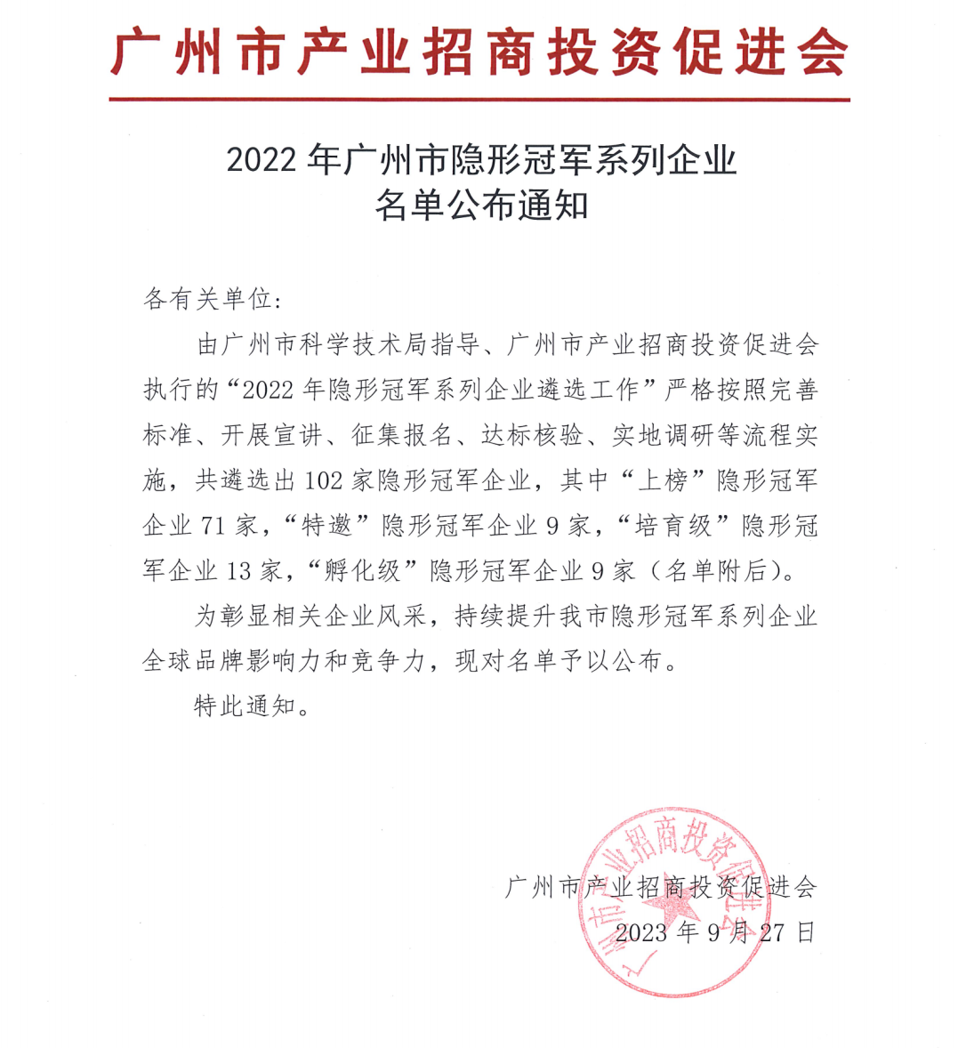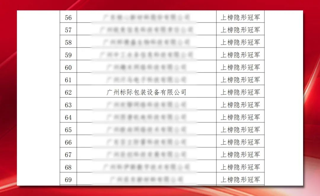 發(fā)布時間:2023-10-17為深入貫徹習(xí)近平總書記“關(guān)于打造更多隱形冠軍”的重要指示精神,落實省市黨委政府及《廣州市國民經(jīng)濟(jì)和社會發(fā)展第十四個五年規(guī)劃和2035年遠(yuǎn)景目標(biāo)綱要》《廣州市科技創(chuàng)新“十四五”規(guī)劃》關(guān)于“發(fā)掘一批創(chuàng)新能力強(qiáng)、行業(yè)地位高、盈利水平好的隱形冠軍企業(yè)”的相關(guān)要求,由廣州市科學(xué)技術(shù)局指導(dǎo)、廣州市產(chǎn)業(yè)招商投資促進(jìn)會執(zhí)行的“2022年隱形冠軍系列企業(yè)遴選工作”嚴(yán)格按照完善標(biāo)準(zhǔn)、開展宣講、征集報名、達(dá)標(biāo)核驗、實地調(diào)研等流程實施,最終“上榜”隱形冠軍企業(yè)僅有71家。廣州標(biāo)際包裝設(shè)備有限公司榜上有名,榮獲“上榜”隱形冠軍企業(yè)。