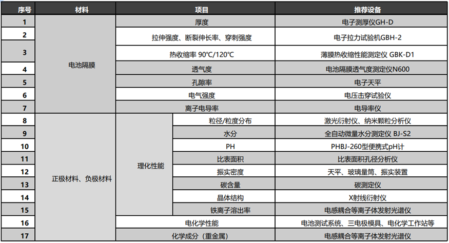 36363-2018 鋰離子電池用聚烯烴隔膜、DB44T 1152-2013 鋰離子電池聚乙烯隔膜等,對電池隔膜的性能要求進行了明確的規定,重點關注的項目有厚度、拉伸穿刺等力學性能,薄膜收縮率、透氣性、孔隙率、水分等,相關項目匯總(包含正負極材料)見下圖: 在相關測試設備中,我司測厚儀、拉力機、薄膜熱收縮性測試儀、透氣度測試儀均可用于電池隔膜的檢測。 對于燃料電池,質子交換膜燃料電池(PEMFC)使用可再生的能源資源-氫氣,可實現零排放,是一種綠色、清潔、高效、可持續發展的一種新能源動力技術,在航空航天、汽車和能源等行業具有廣泛的應用。質子交換膜(PEM)是質子交換膜燃料電池中最重要的部件之一,隨著燃料電池的不斷發展,對質子交換膜性能的要求也逐漸升高,根據GB/T 20042.3-2022《質子交換膜燃料電池 第3部分: 質子交換膜測試方法》,質子交換膜需要開展的測試項目包括透氣率、拉伸性能、180°剝離強度、厚度、質子傳導率、離子交換當量等測試項目。其中GB/T